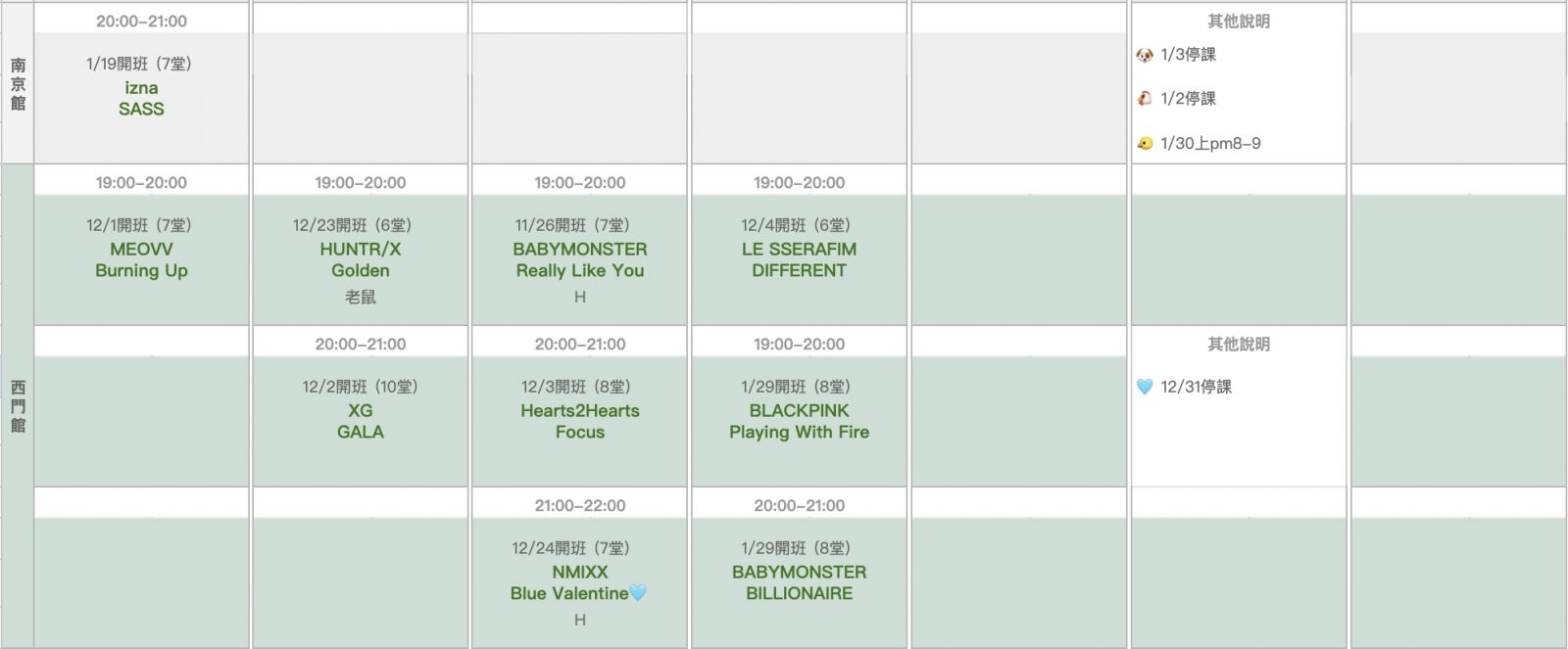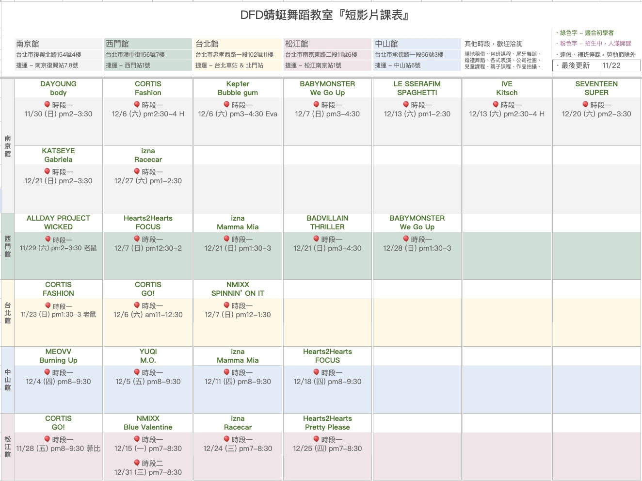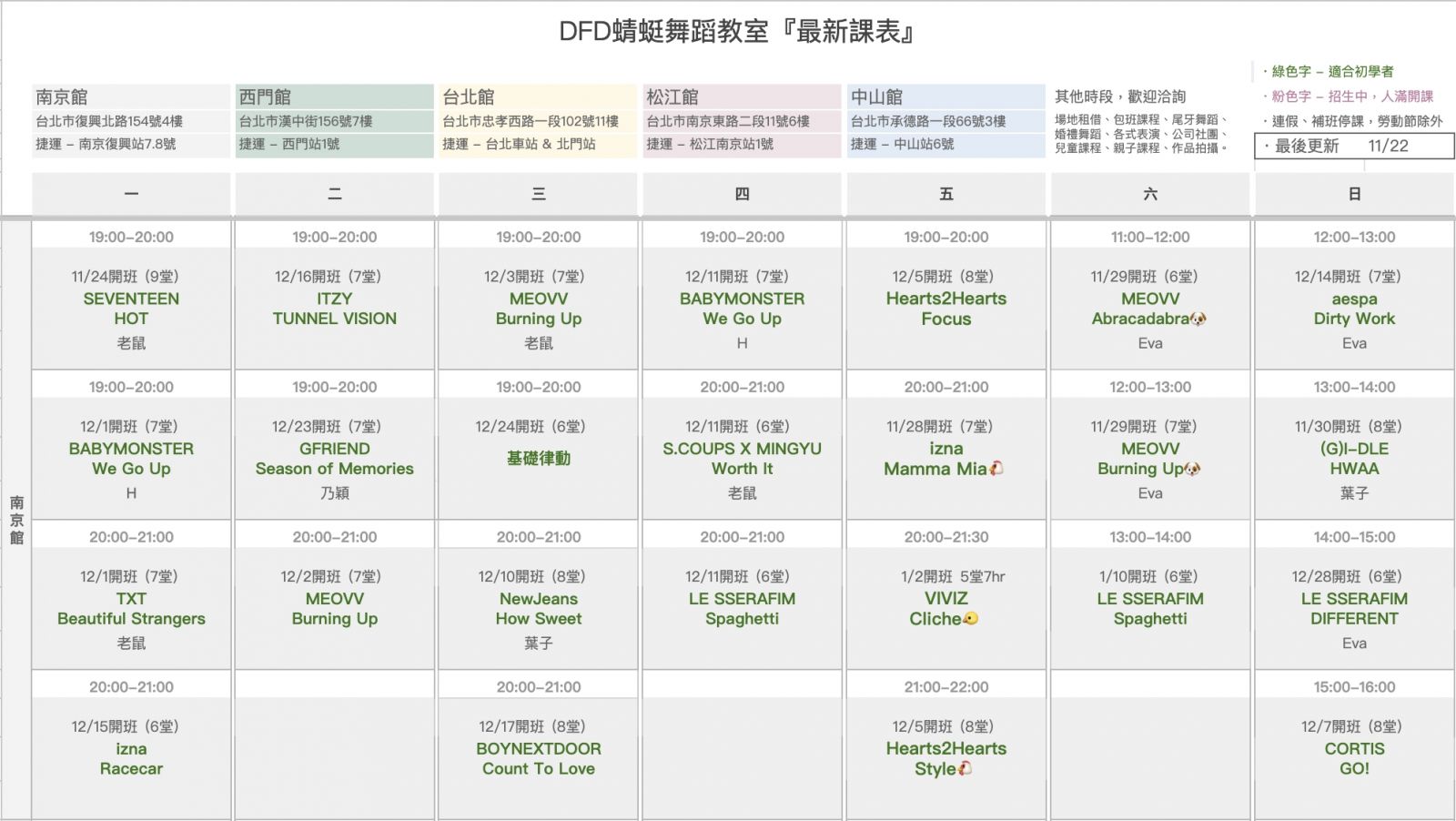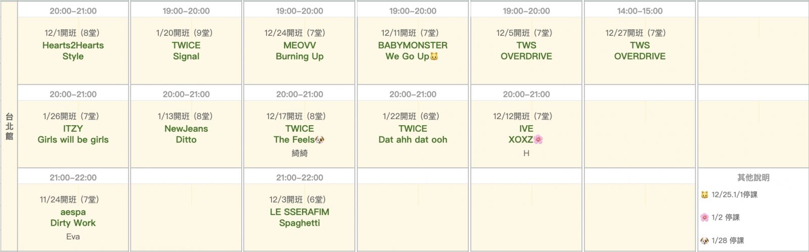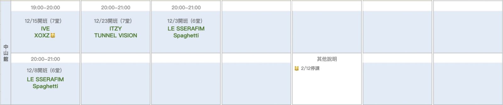 ▼下表為已確定開班團體課程,每首舞曲的上課時間為 下表「上課期間」內 每週1次、每次1小時。 更新:11/22 |
